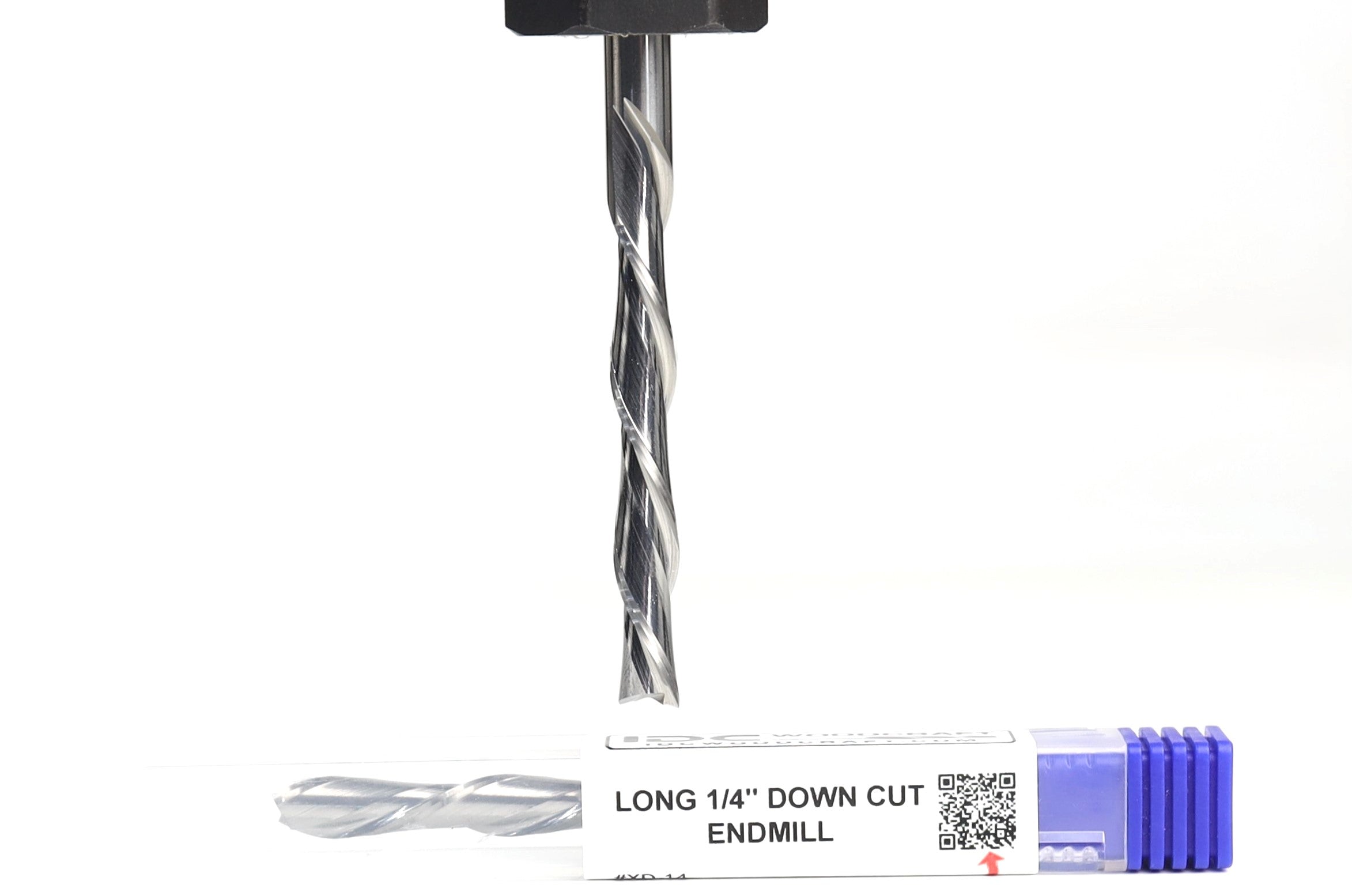 This 1/4 extra long straight router bit for CNC routers (1/4 shank) is the main cutting and finishing down cut extended length endmill for cutting guitar bodies, keepsake boxes, and other unusually thick woodworking projects, such as deep 3D carvings or recessed work. This extended 1/4" down-cutting bit will clean up your wood projects to a full 1.75"!